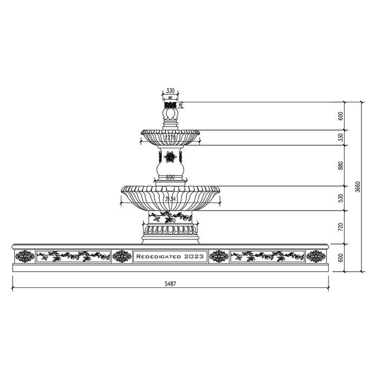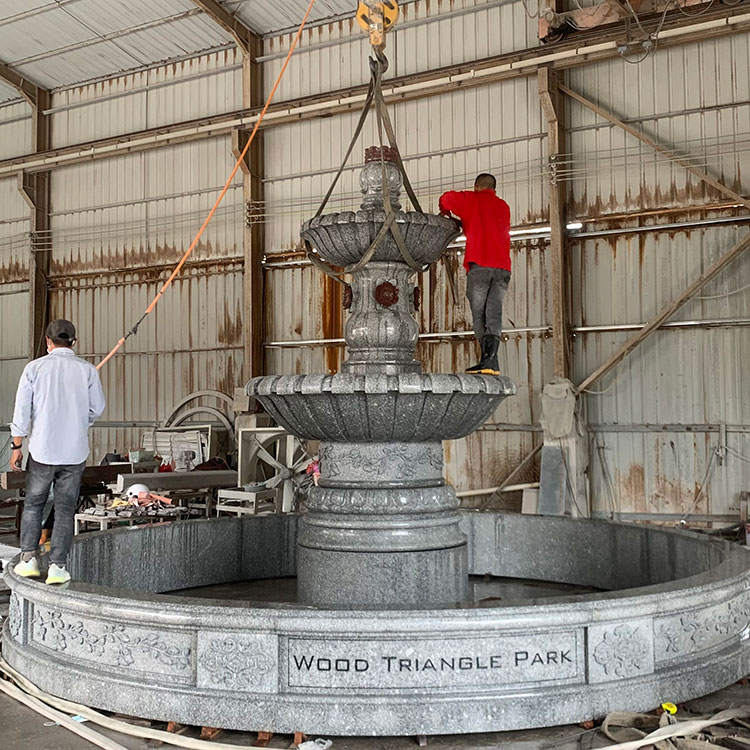 Tekantis fontanas yra pagamintas iš kalkakmenio, importuoto iš Egipto, ir yra puikiai sukurtas naudojant mašiną ir rankų darbą. Vanduo iš baseino pumpuojamas į fontano viršų, kur išsipurškia. Vanduo teka žemyn per akmeninių baseinų pakopas ir galiausiai į apatinį baseiną. Šis gaminys naudojamas aikštėse, parkuose ir kiemuose.
